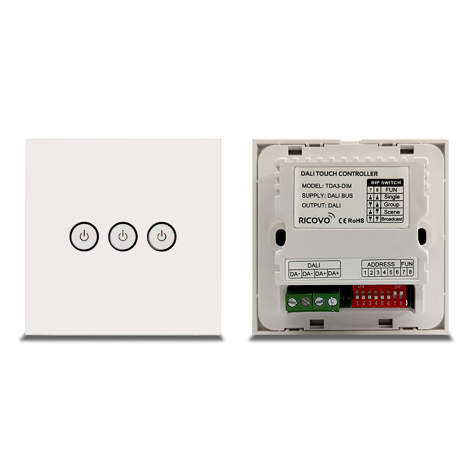 TDA3-CCT具有3路触摸按钮,在单地址控制模式、主控制模式和广播控制模式下,第一个触摸按键长按调暗或者调亮,第二个触摸按键短按开灯或者关灯,第三个触摸按键长按调更冷色温或者调更暖色温;在场景控制模式下,第一个触摸按键为拨码开关设定的地址n,第二个触摸按键为场景n+1,第三个触摸按键为场景n+2,若拨码开关设定的场景地址为15,则第二和第三个触摸按键分别为场景0和场景1,依次类推,短触摸触发场景。